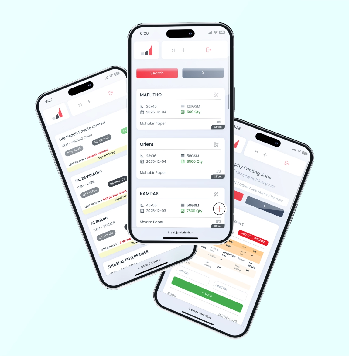 Saluja Graphix partnered with Clarion IT Pvt Ltd in Raipur to solve their challenge of managing a fast‑moving print and design business from one place. They weren’t just looking for another off‑the‑shelf tool—they needed custom software solutions that could mirror the way their team actually works, from job creation and design assignment to stock usage and final dispatch. The result was a complete web app where every order becomes a tracked workflow, showing whether it’s assigned to a designer, in progress, shared with the client for review, approved or ready for printing and delivery.